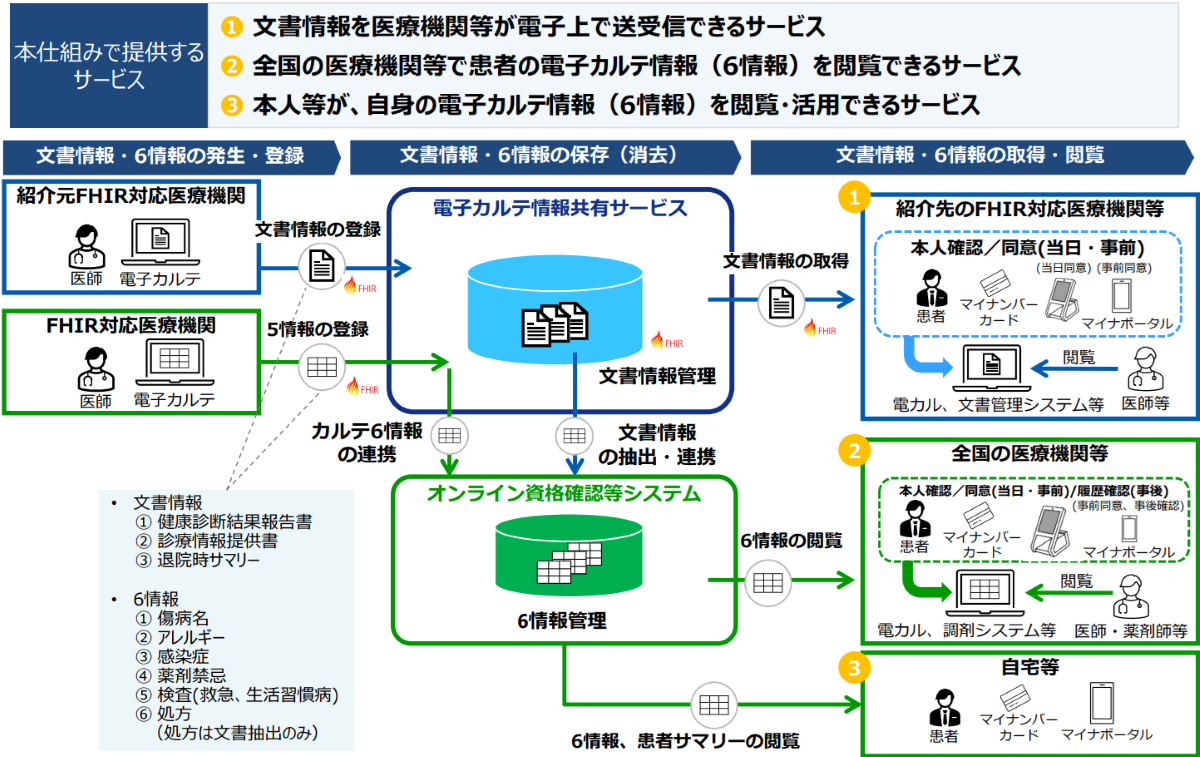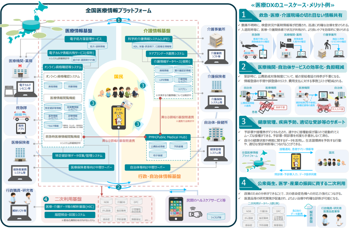 オンライン資格確認システムのネットワークを拡充し、レセプト・特定健診情報に加え、予防接種、電子処方箋情報、電子カルテなどの医療機関等が発生源となる医療情報(介護含む)を、クラウド上で統合・共有する国家基盤の情報基盤です。
